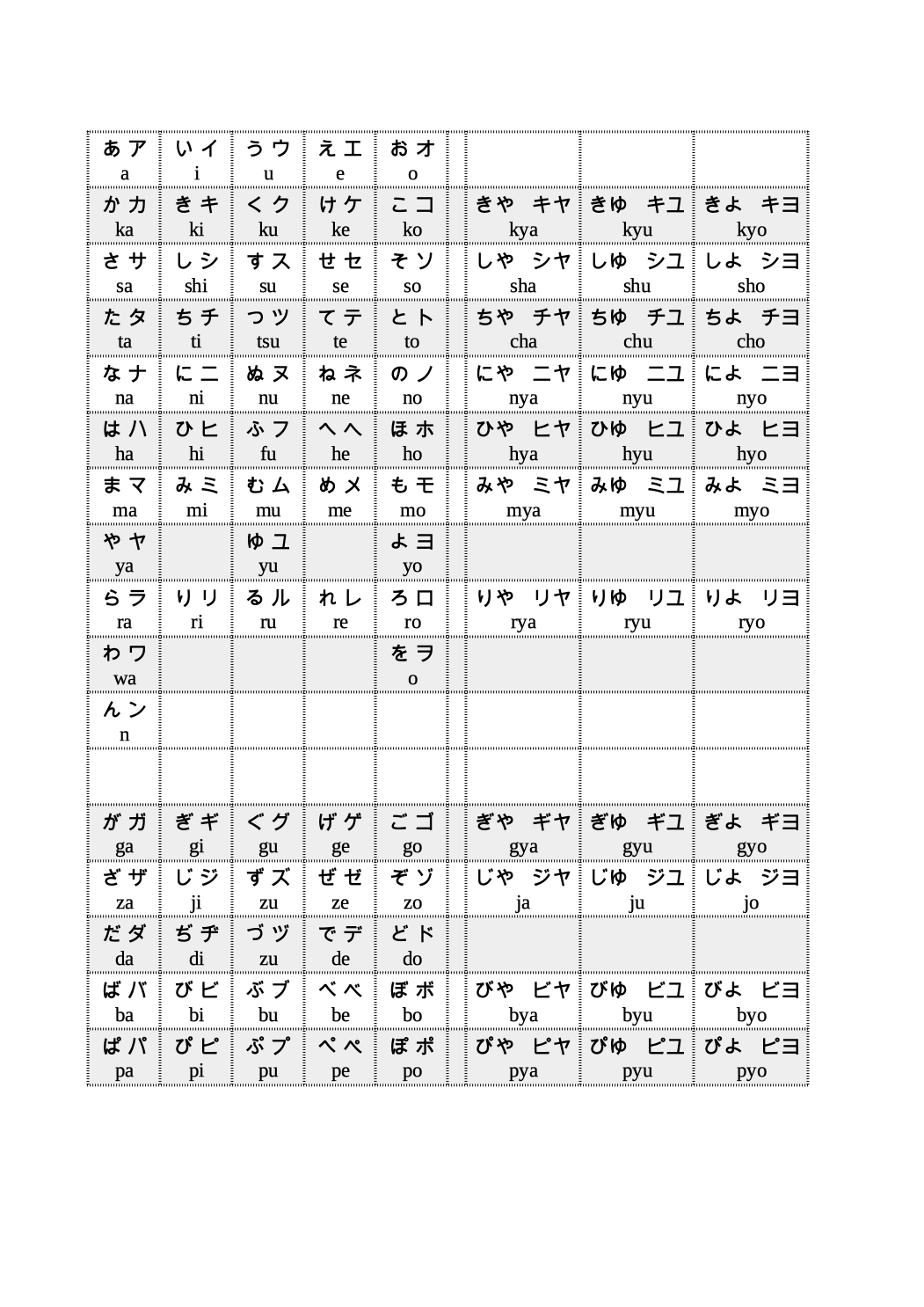 | きや キヤ kya | きゆ キユ kyu | きよ キヨ kyo |
